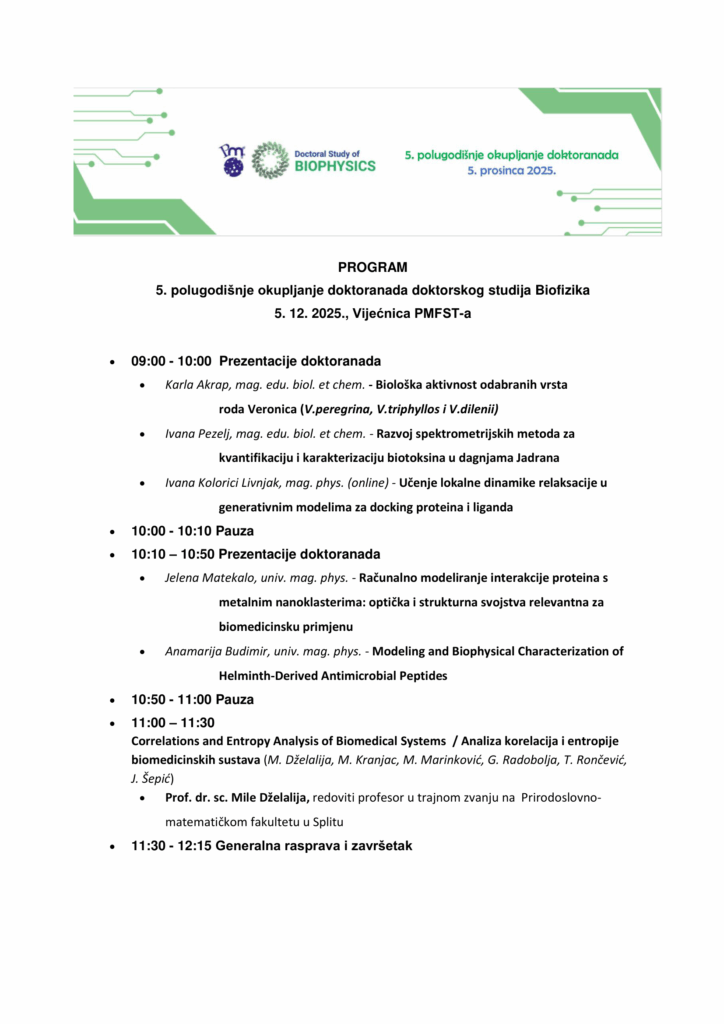 U petak, 5. prosinca 2025., u Vijećnici PMFST-a održat ćemo 5. polugodišnje okupljanje doktoranada doktorskog studija Biofizika.